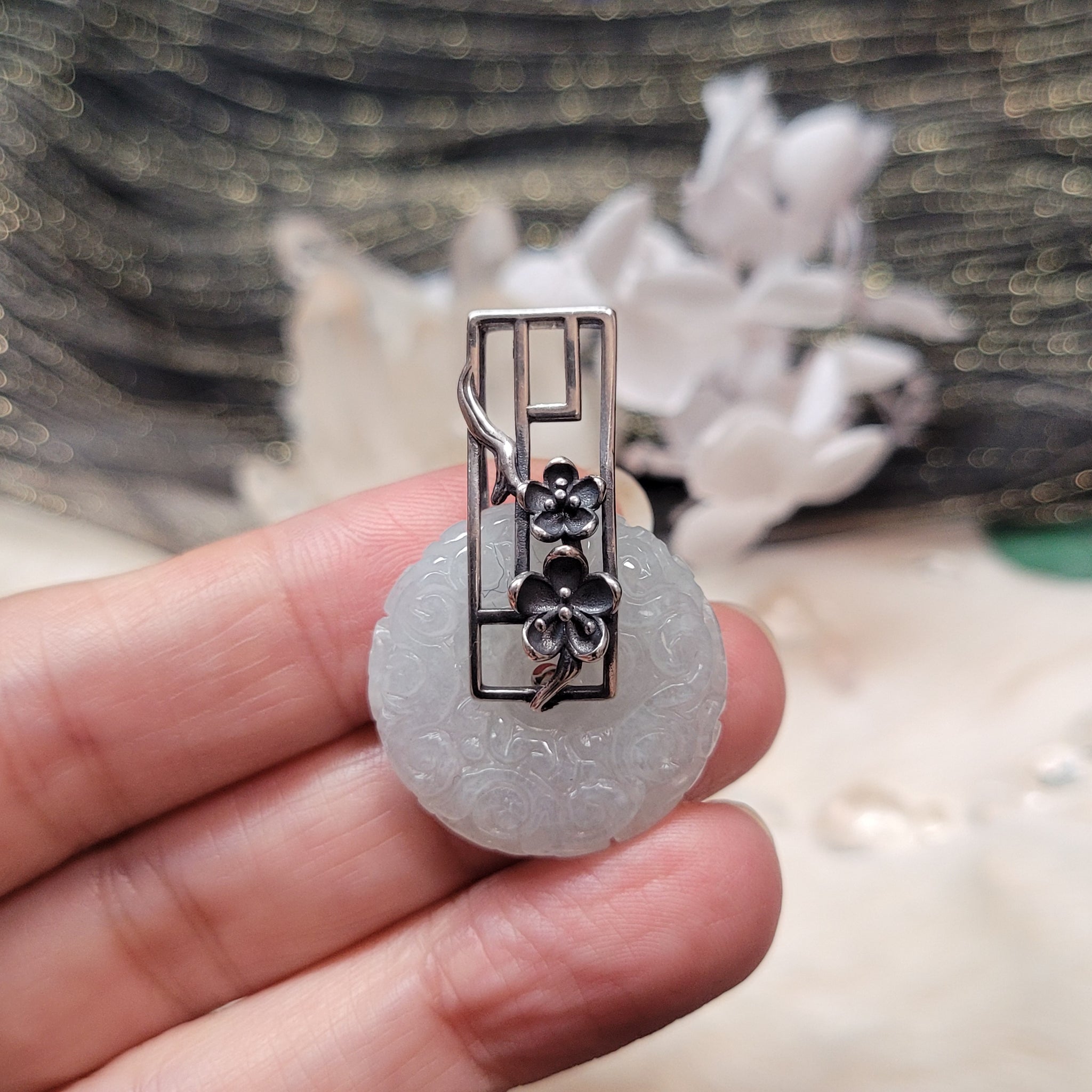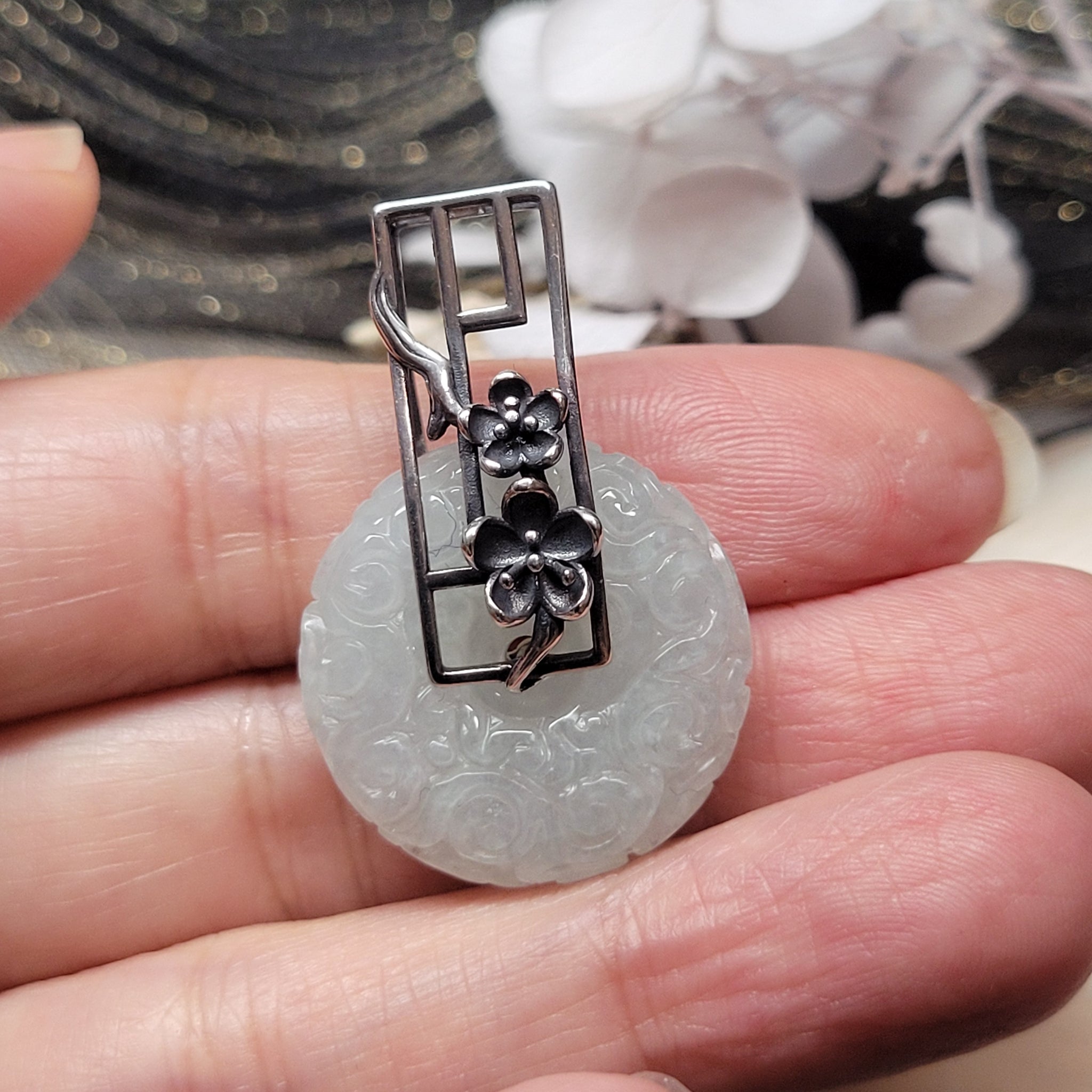 晴水綠翡翠雕刻平安扣S925純銀吊墜