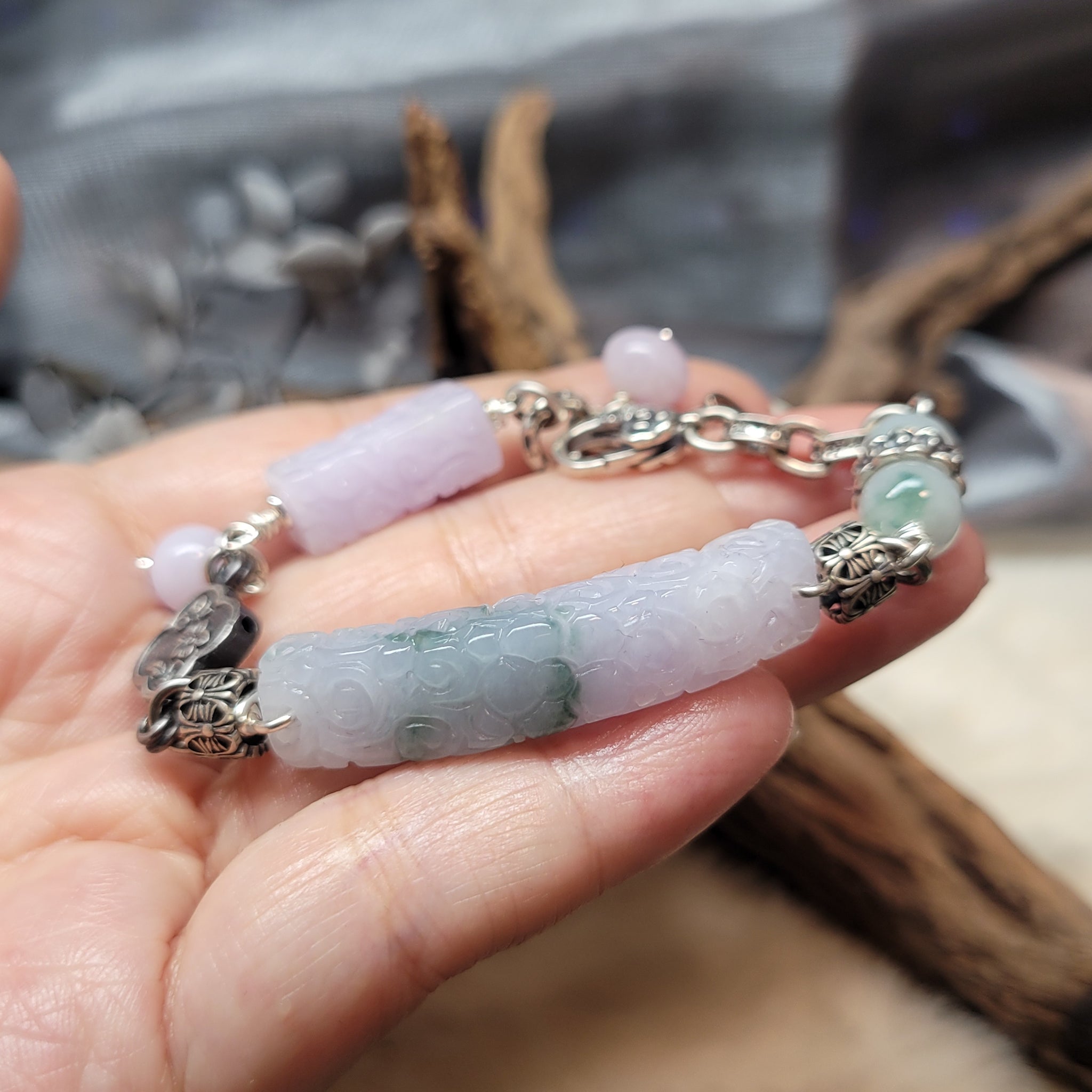 1229 A貨翡翠紫飘花手牌銀手鏈