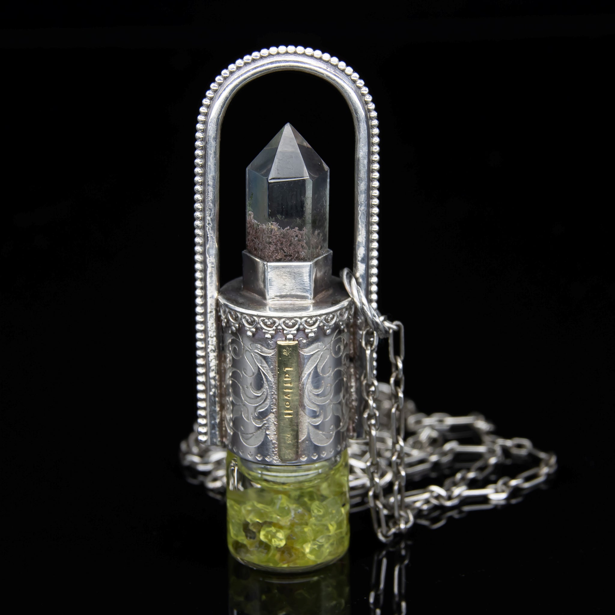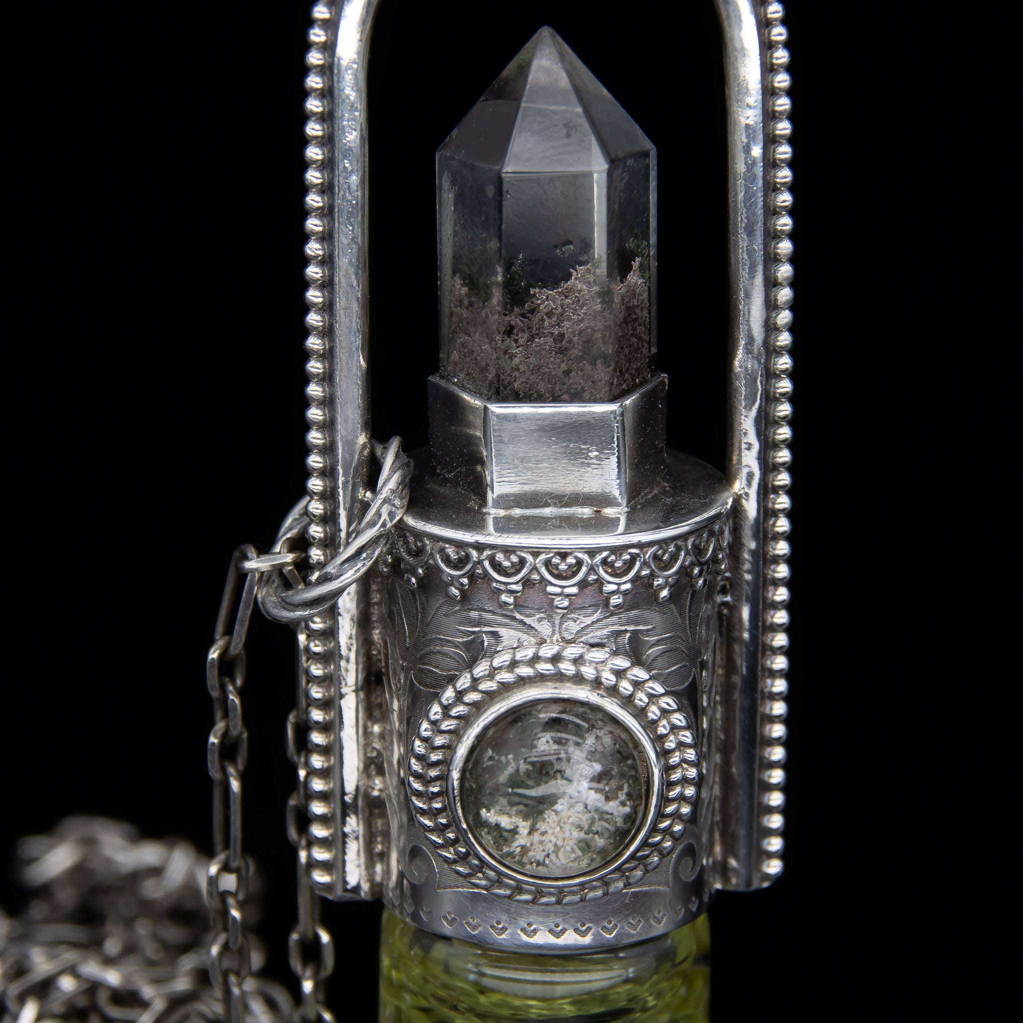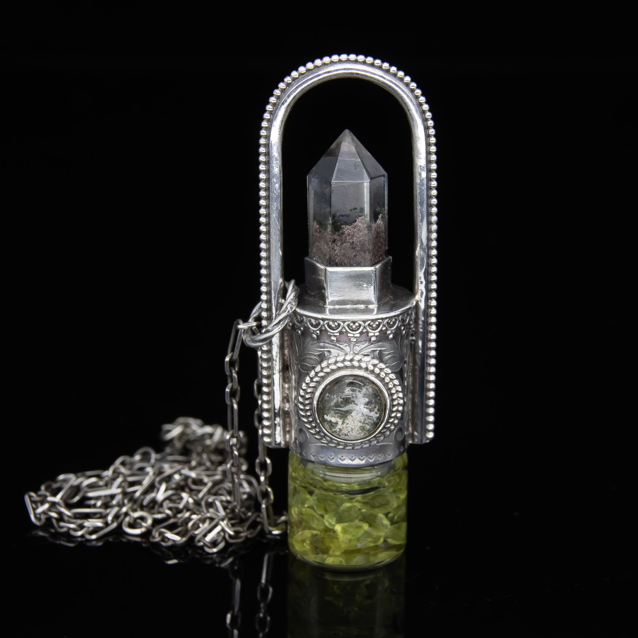 This Black Leaf themed sterling silver necklace is one of the Fountain series. It consists of an inverted U shape hanger and includes a Phantom quartz cap surrounded by a bezel that sits on top of a Black Leaf pattern design together with facing Phantom quartz. A work of art to house your favorite oils.