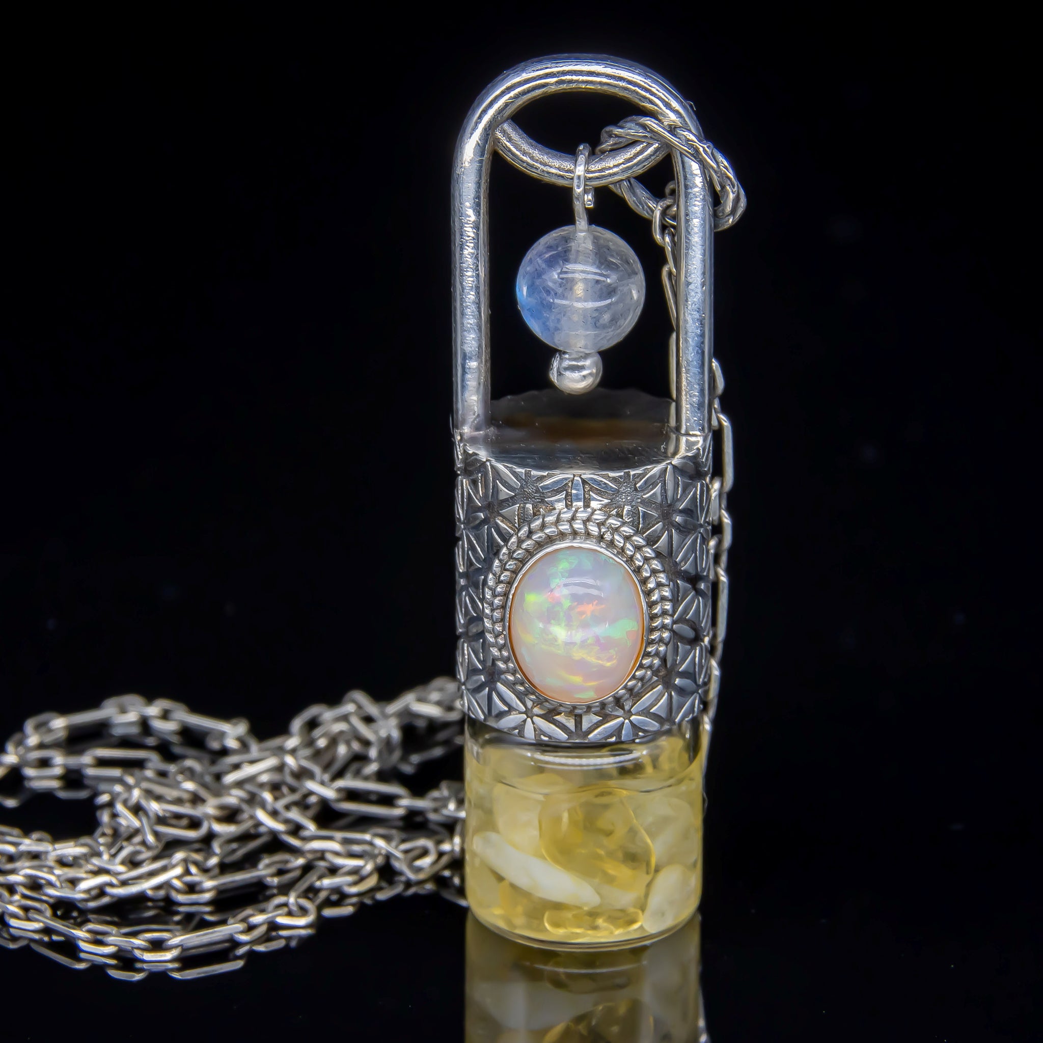 This necklace consists of a Flower of Life pattern design with a hanging Moonstone bead and a facing Opal gemstone. A work of art to house your favorite oils.