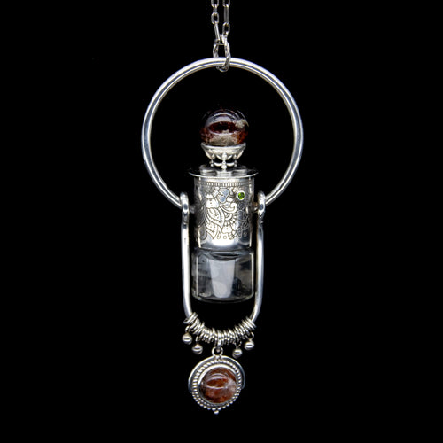 Fountain Sunset Rollerball Necklace Series - Amber & Yellow Rutilated Quartz on Black Leaf Pattern