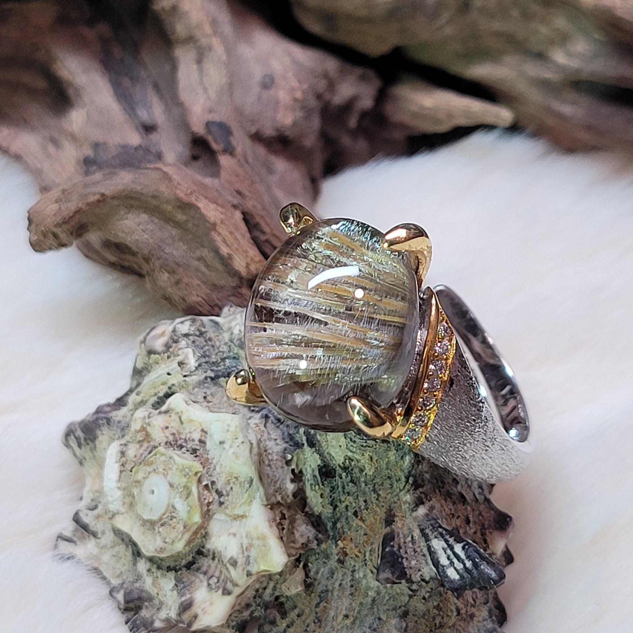 0544 黑銀肽發晶共生礦925銀戒指(不限指圍)