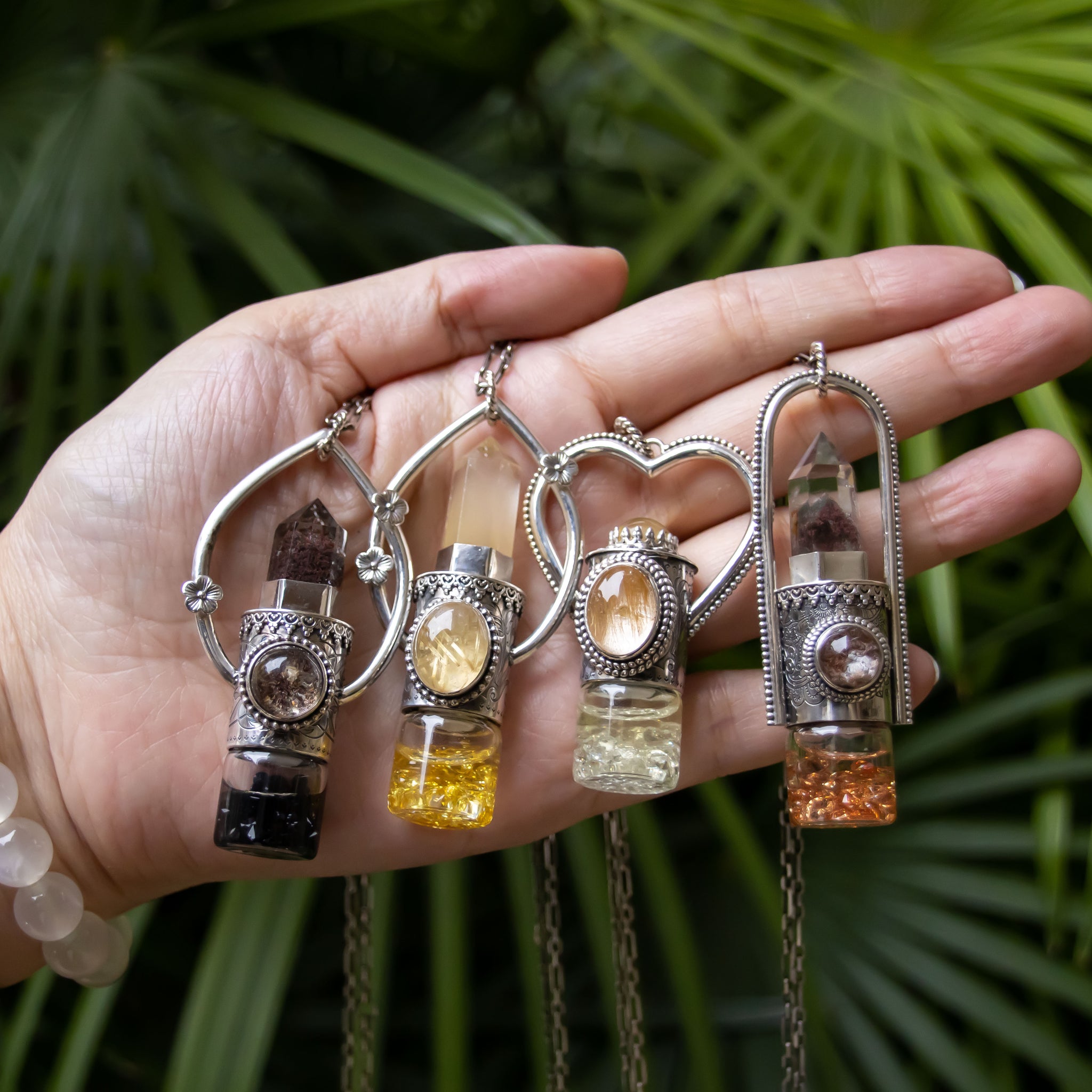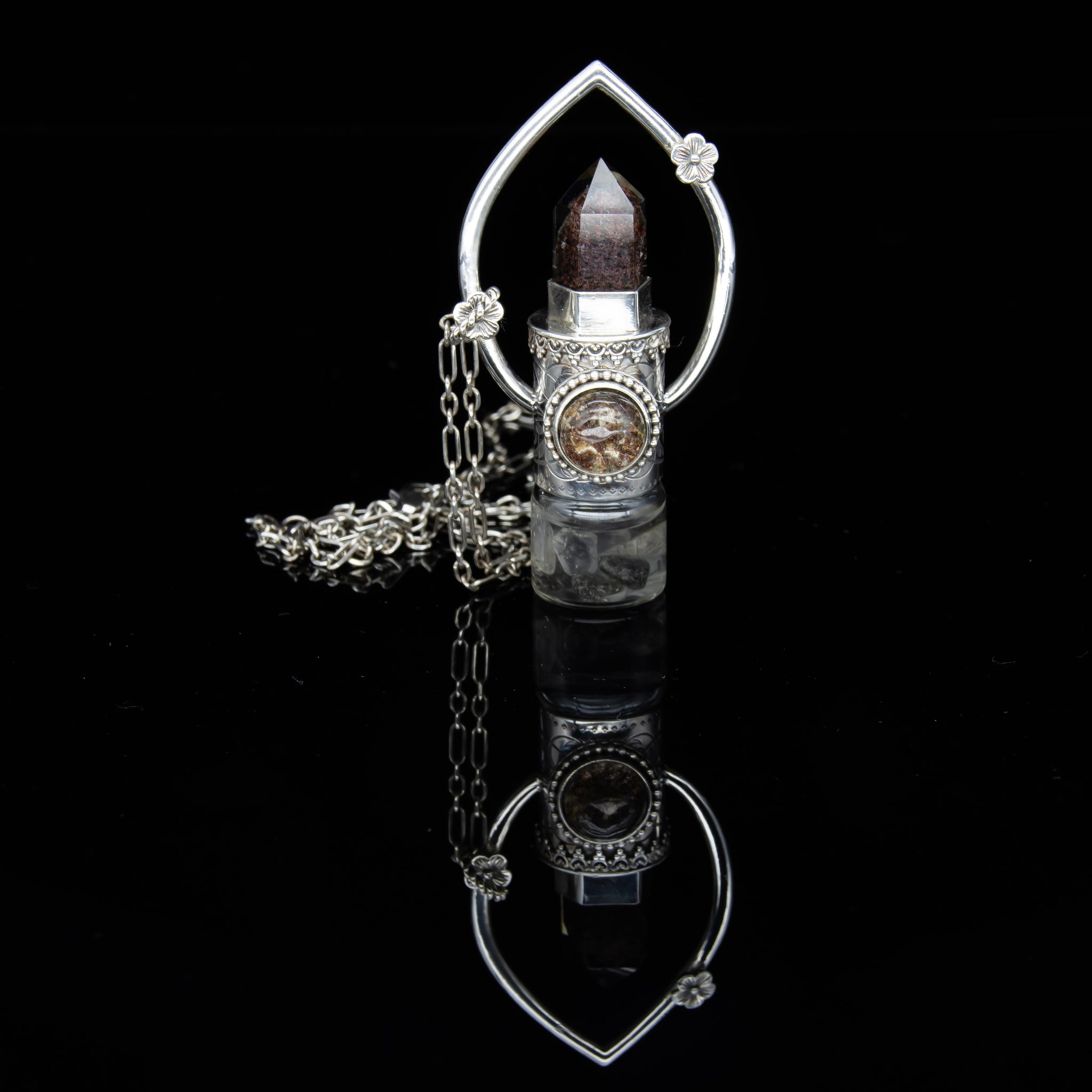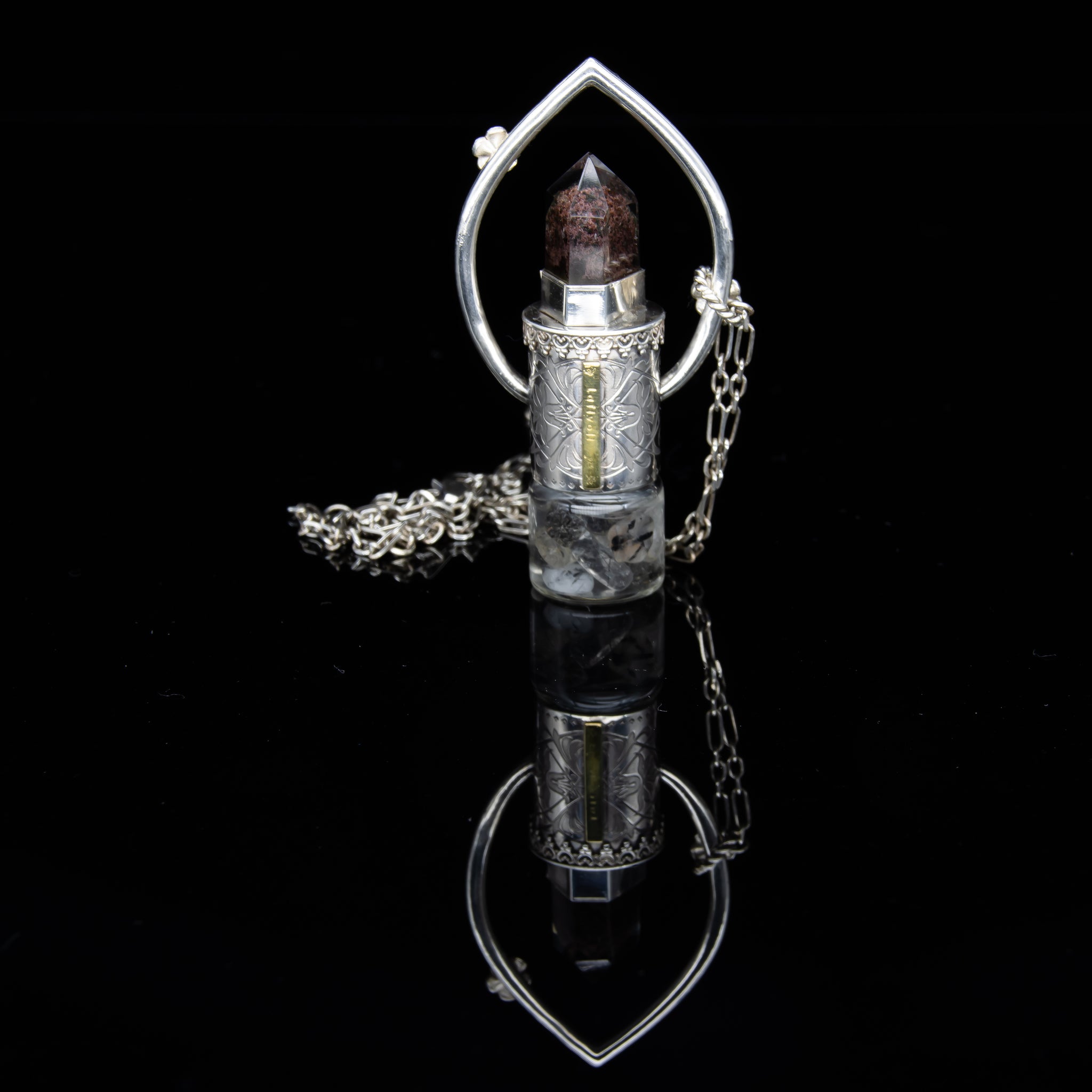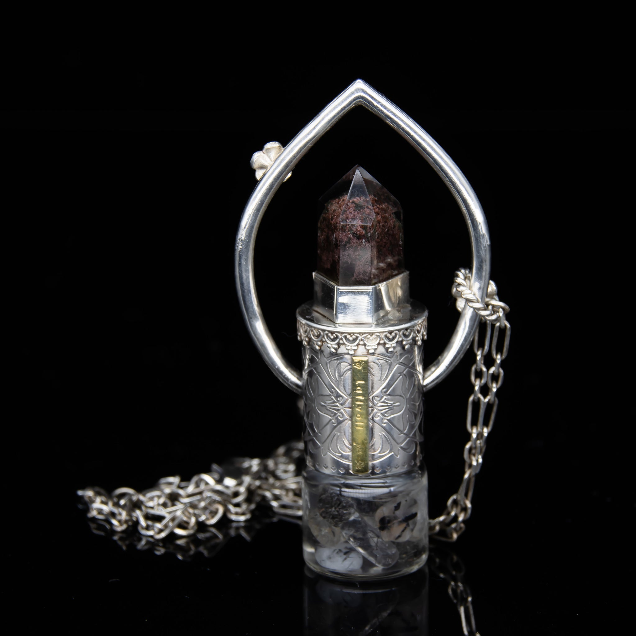 This Black Leaf themed sterling silver necklace is the first of four types of the Fountain Sunset series. It consists of a dome shape hanger and includes a Phantom quartz cap surrounded by a bezel that sits on top of a black leaf pattern design together with facing Phantom quartz. A work of art to house your favorite oils.