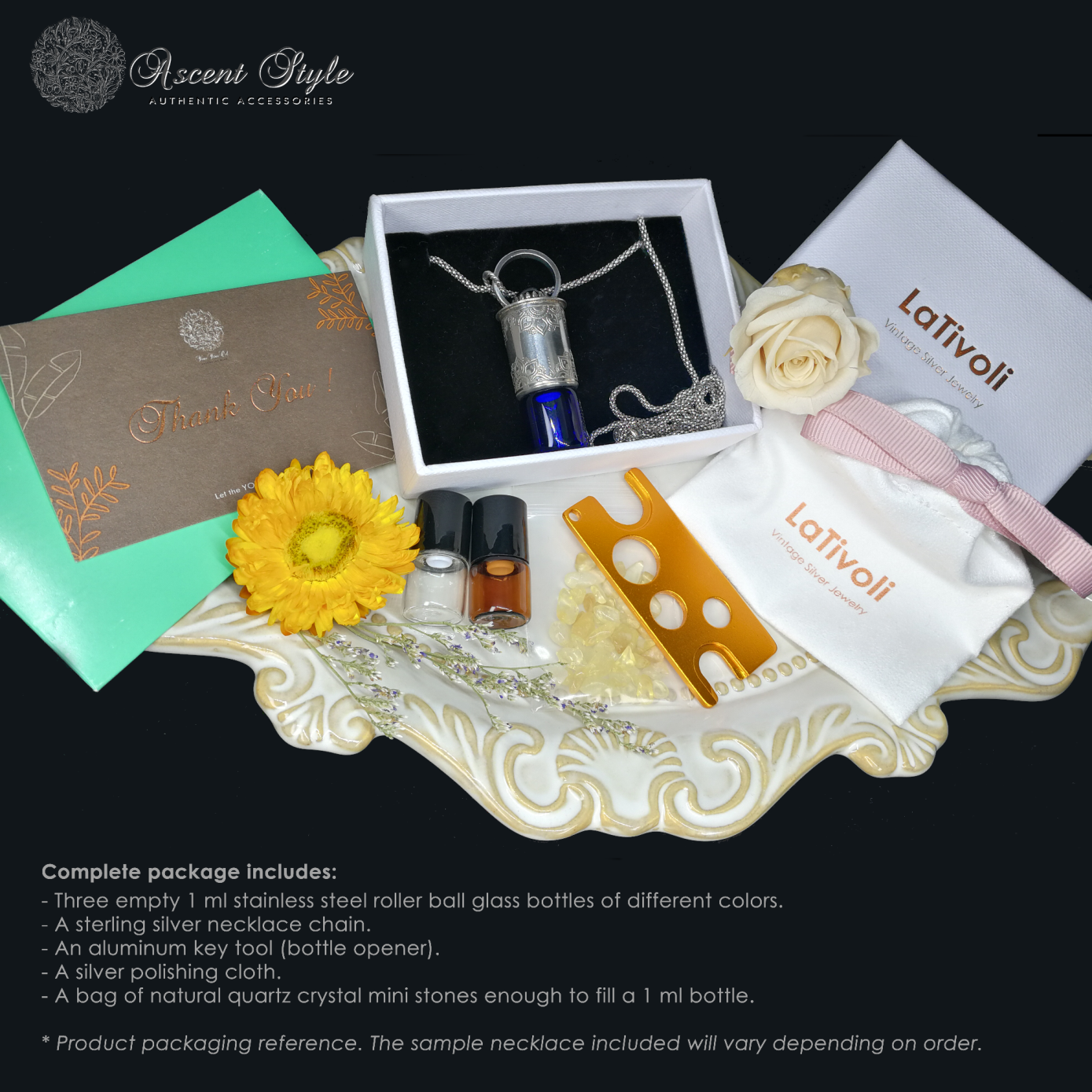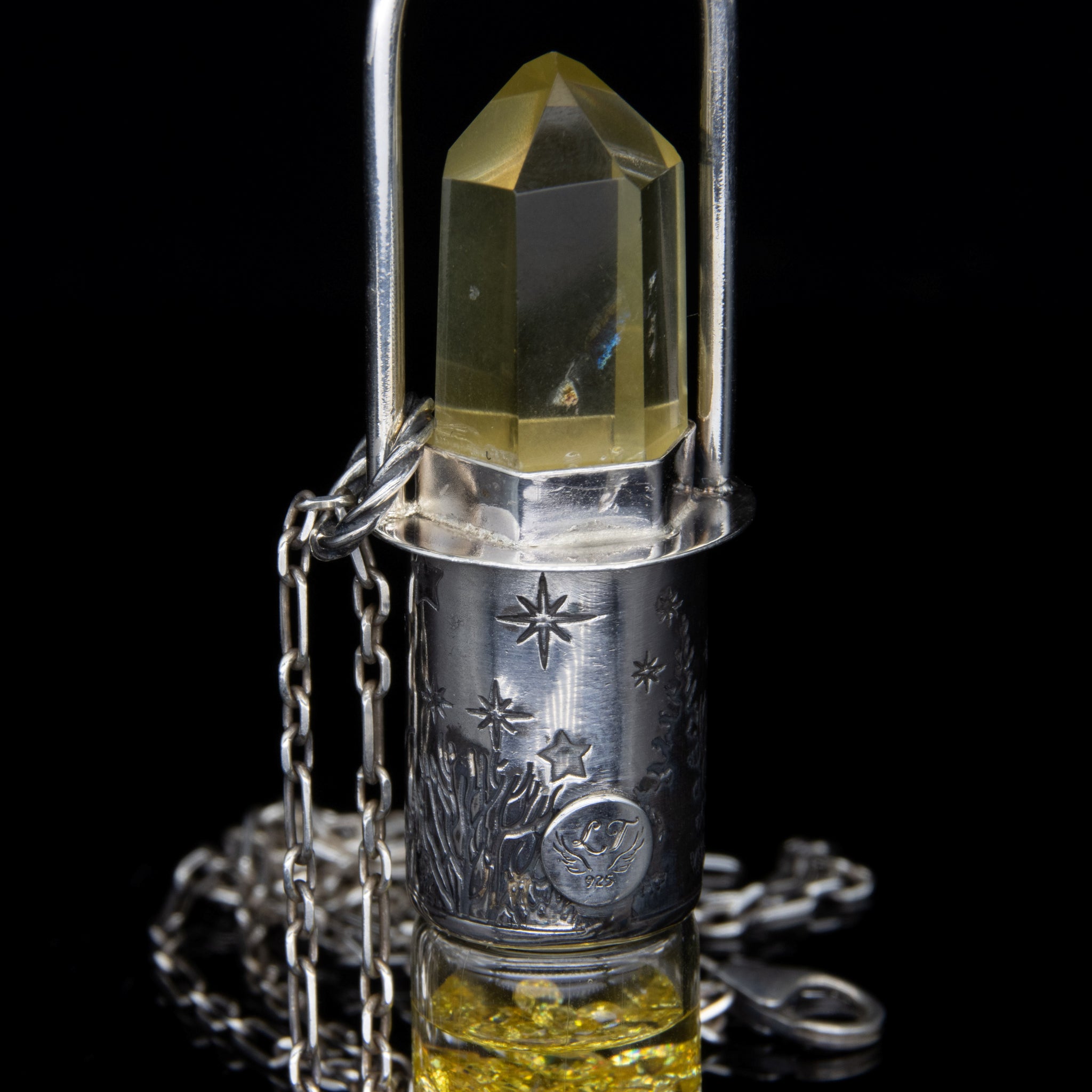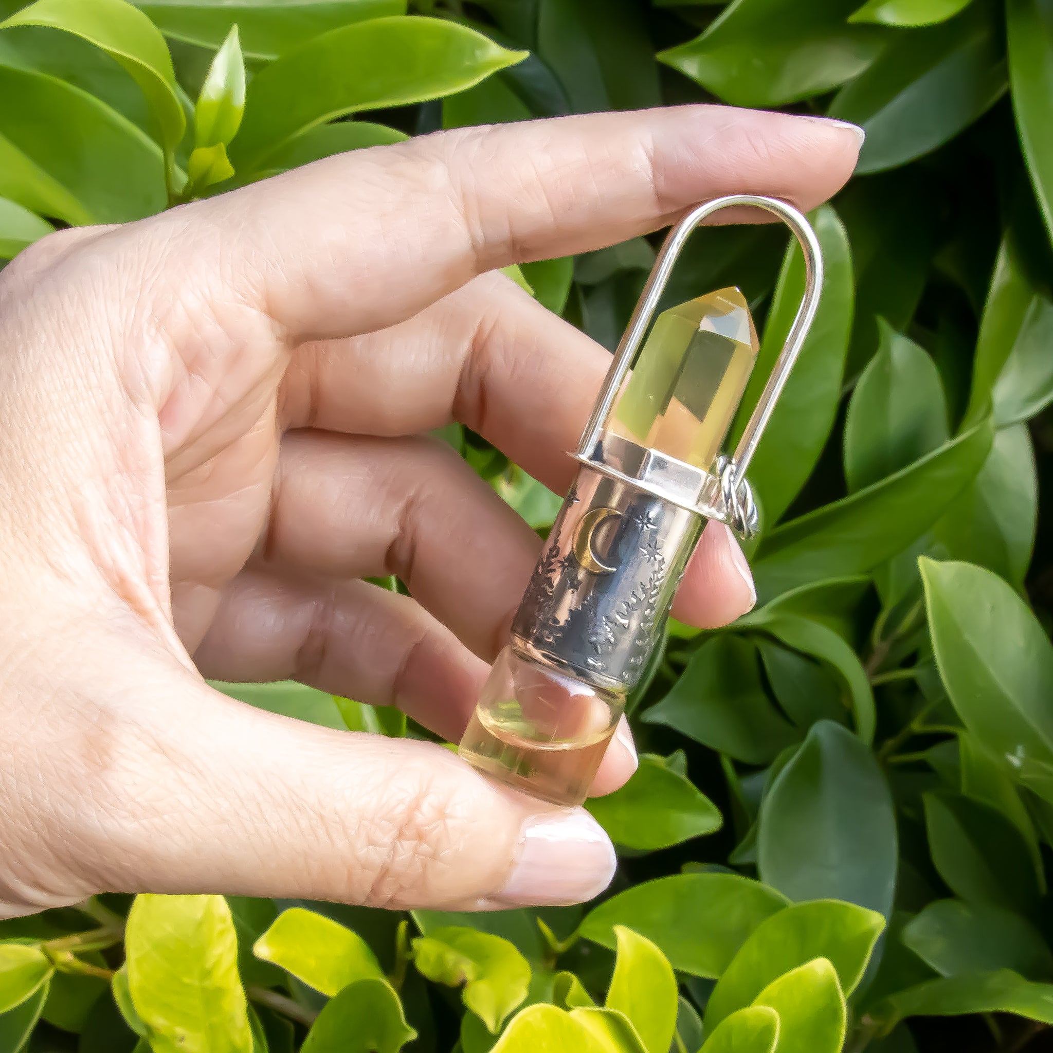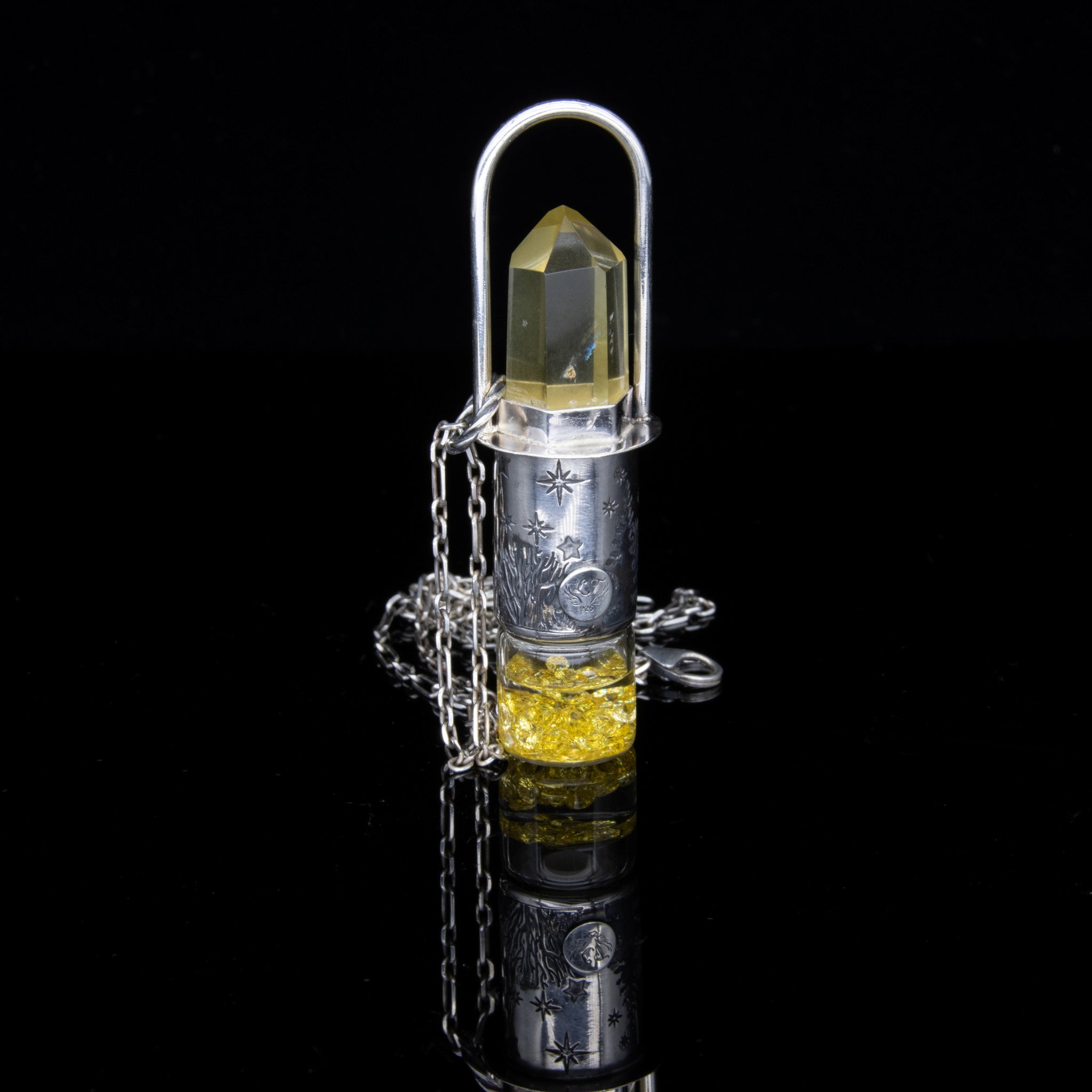 This Rain Forest themed sterling silver necklace is the second of three types of the Lagoon Sunlight series. It includes a Citrine crystal cap surrounded by a bezel that sits on top of a Rain Forest pattern design. A work of art to house your favorite oils.