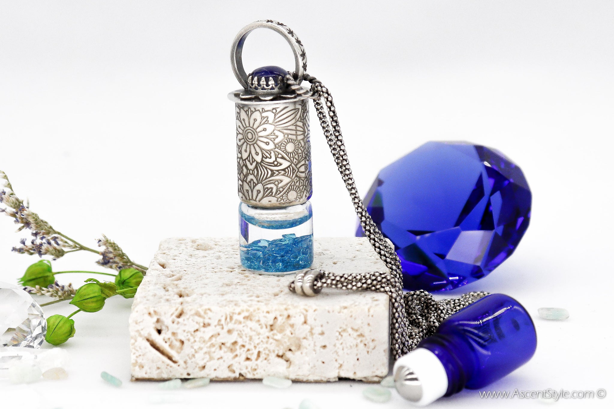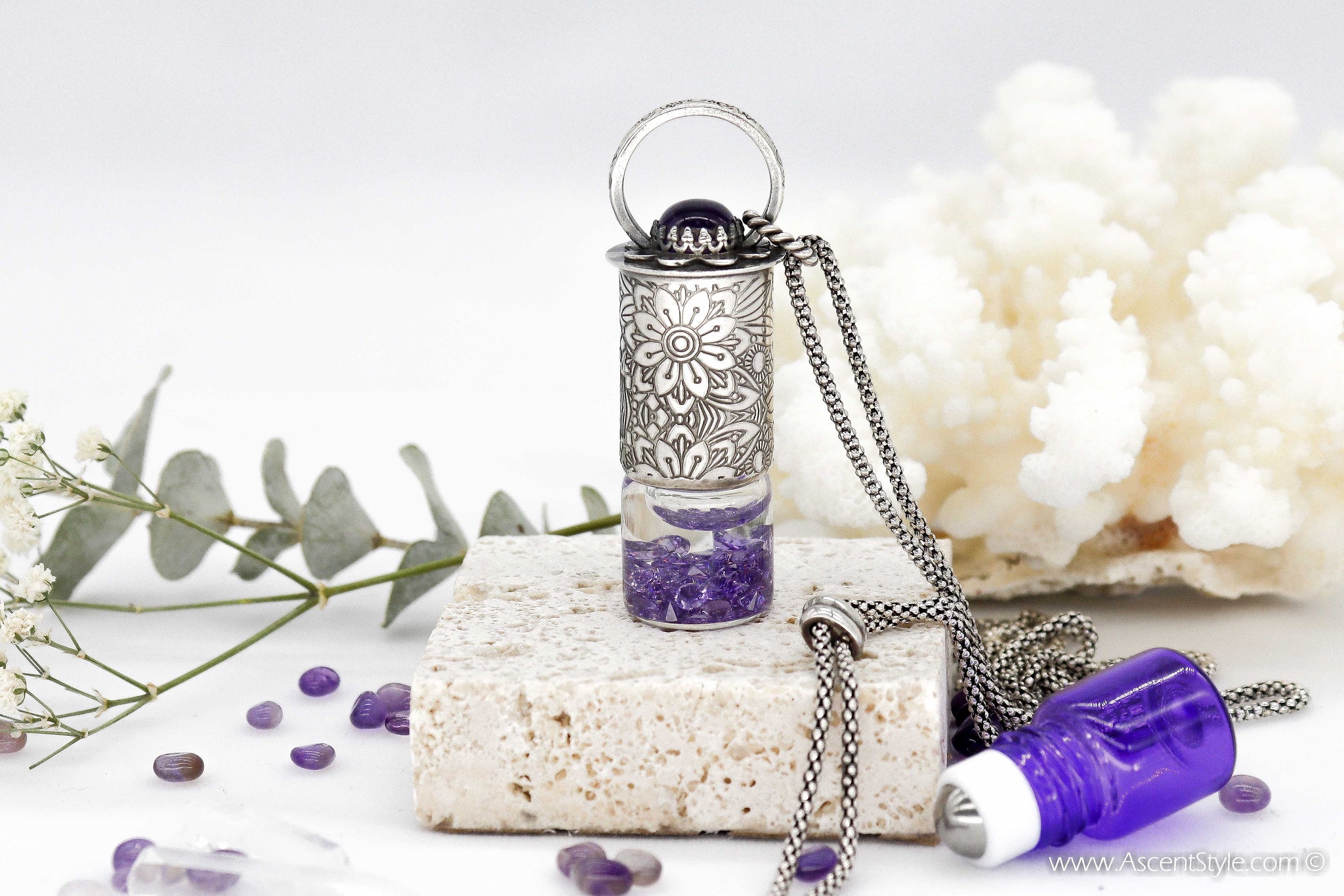 This beautifully designed series of handmade sterling silver necklace provides you with a choice of Amethyst, Black Onyx, Moonstone & Lapis gemstone caps surrounded by an antique bezel that sits on top of our Secret Garden pattern design lid. A work of art to house your favorite oils.